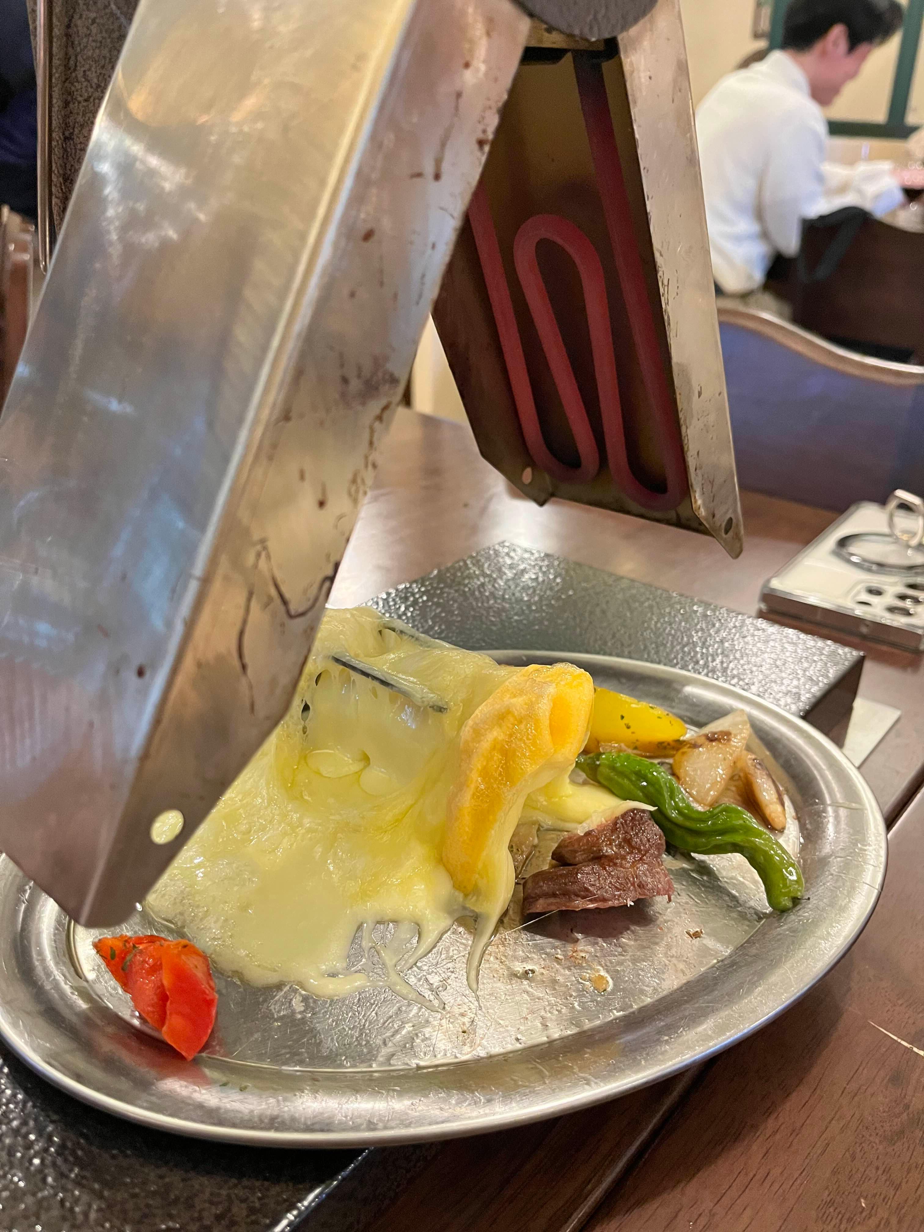 가족이나 친구들이 모여서 라클렛 전용 그릴을 가운데 두고 치즈를 녹여 각자 원하는 재료에 곁들여 먹는 방식이에요.